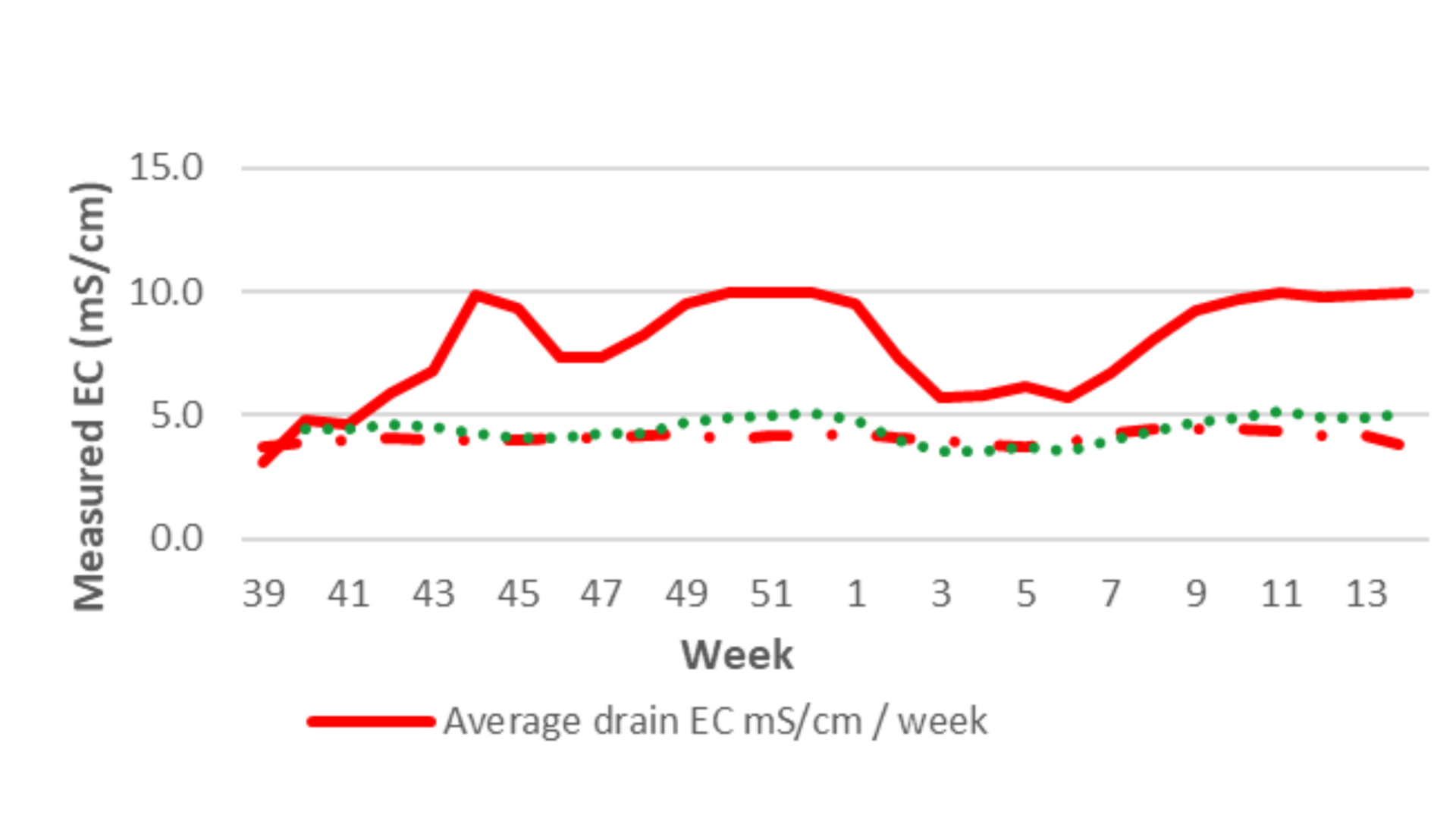 Figuur 1: Wekelijks gemiddelde EC van druppel, mat en drain (mS/cm) tijdens een proef met tomaten teelt met laag energieverbruik onder volledige ledteelt (2024). De rode ononderbroken lijn geeft de gemiddelde EC in de drain weer, de groene stippellijn de gemiddelde EC in de mat en de rode stippellijn de gemiddelde EC in de druppel.